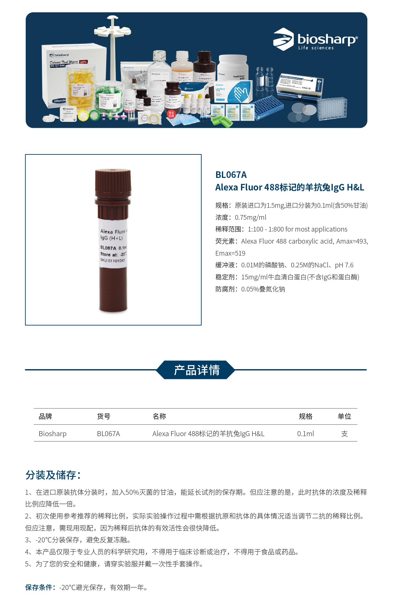 BL067A Alexa Fluor 488标记的羊抗兔IgG