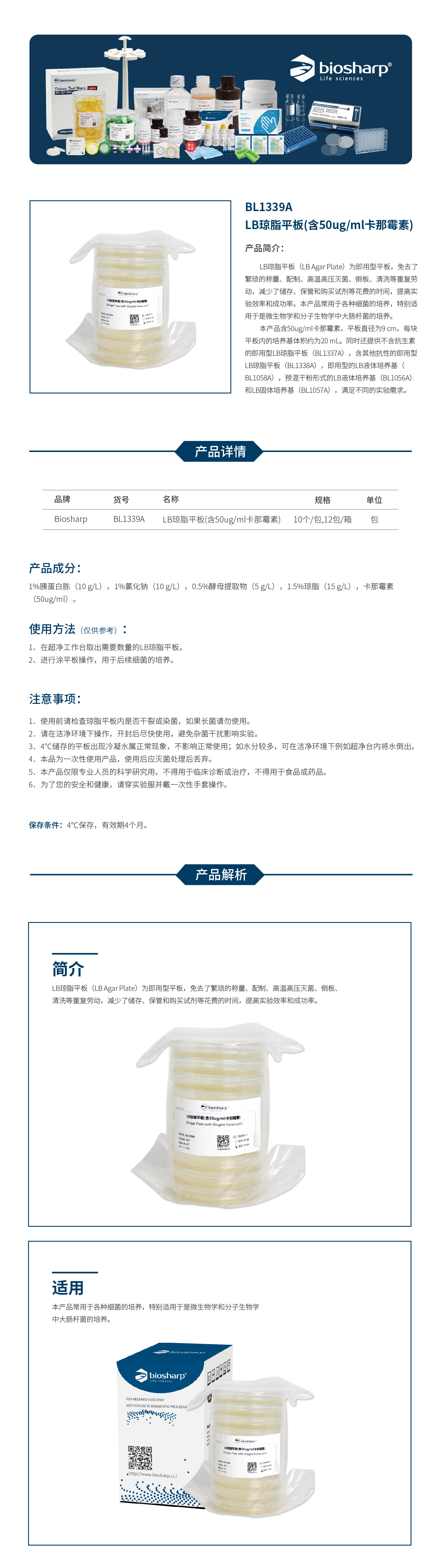 BL1339A LB琼脂平板(含50ug/ml卡那霉素)