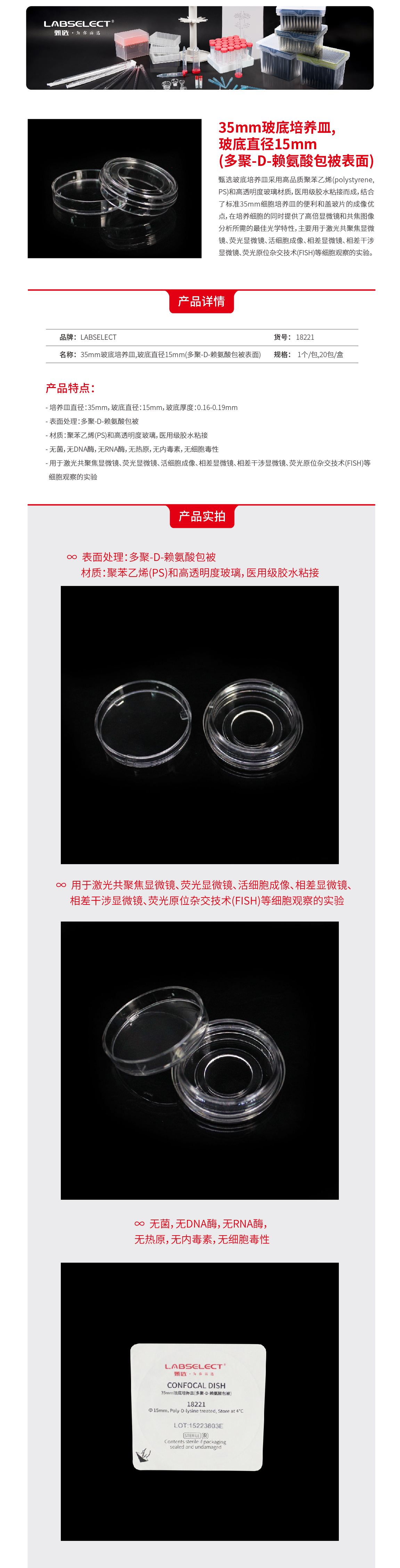 18221 35mm玻底培养皿,玻底直径15mm(多聚-D-赖氨酸包被表面)