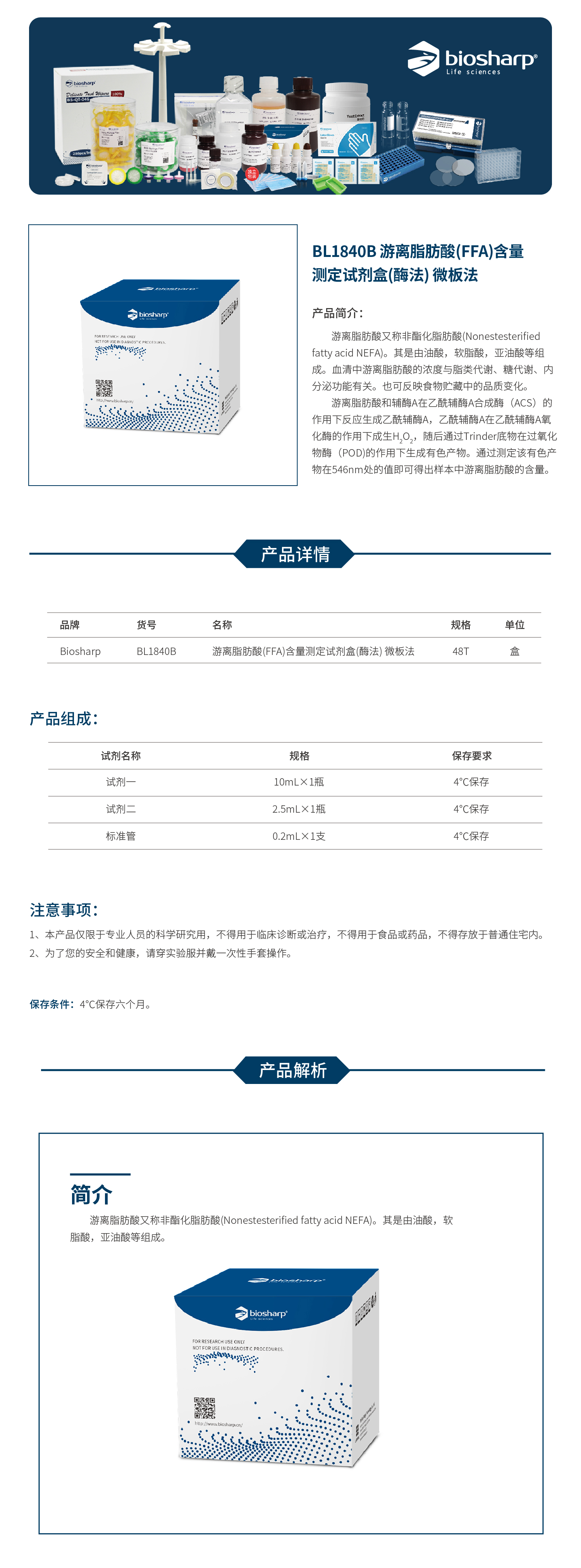 BL1840B 游离脂肪酸(FFA)含量测定试剂盒(酶法) 微板法