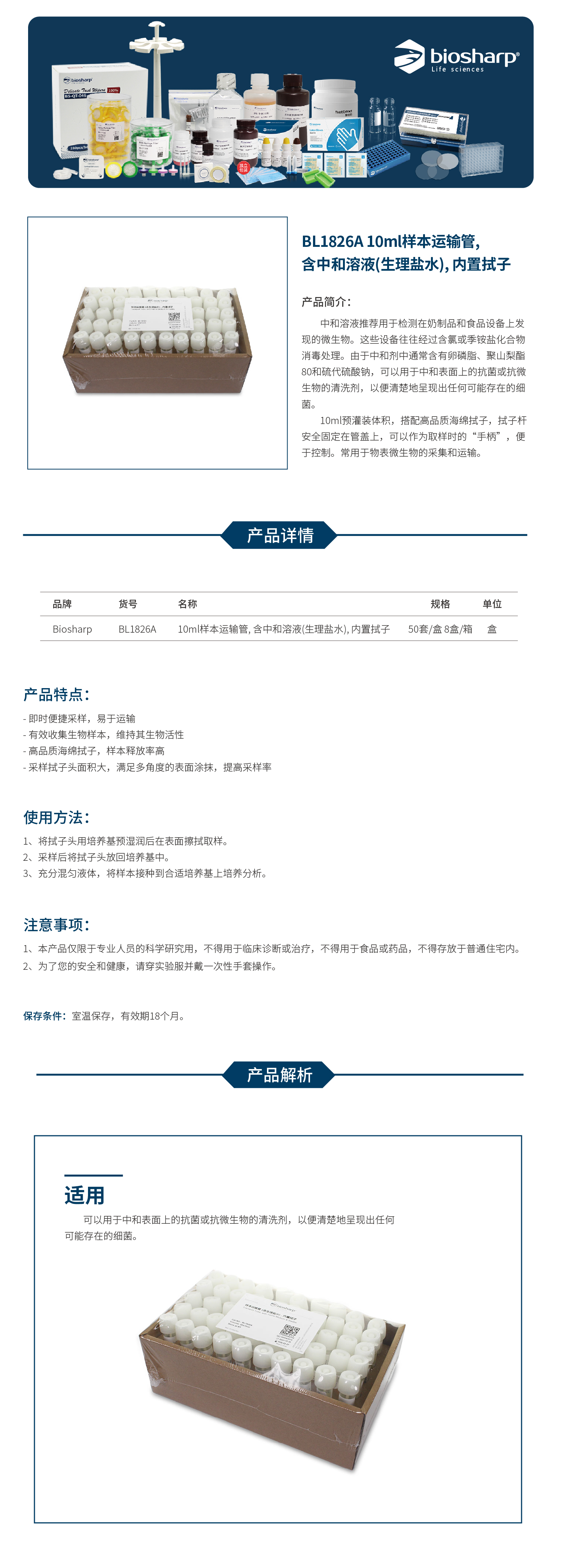 BL1826A 10ml样本运输管, 含中和溶液(生理盐水), 内置拭子