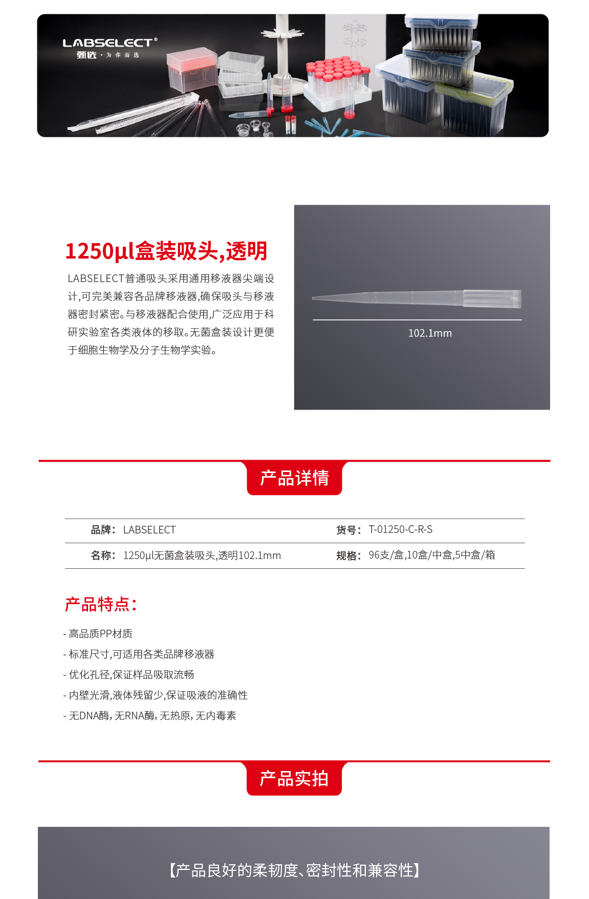 T-01250-C-R-S 1250μL无菌盒装吸头,透明102.1mm
