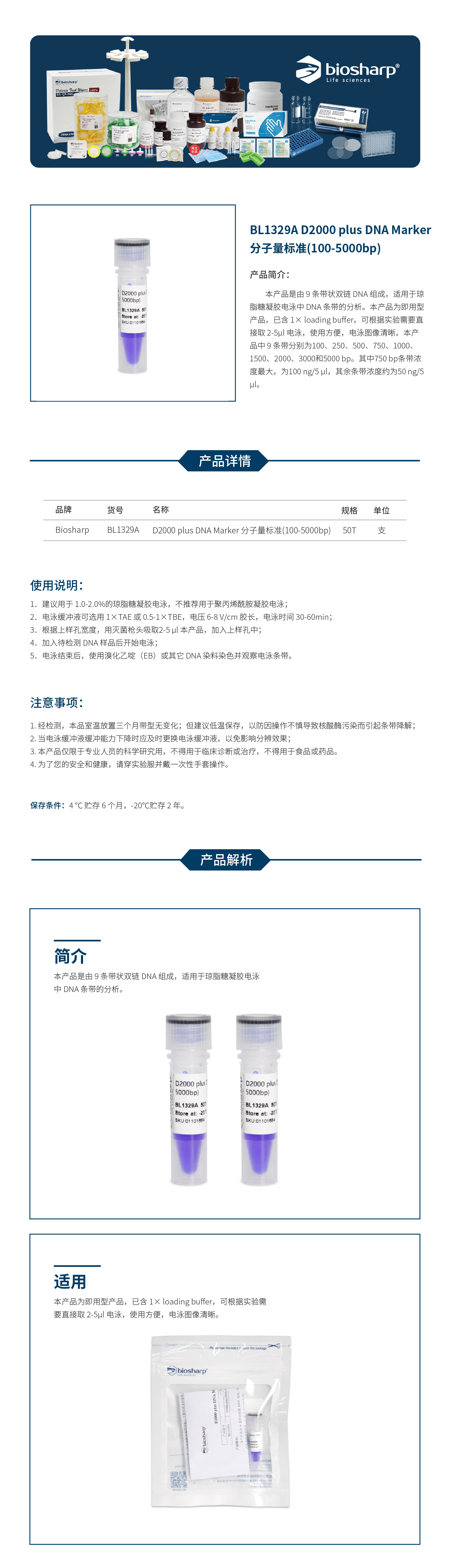 BL1329A D2000 plus DNA Marker 分子量标准(100-5000bp)