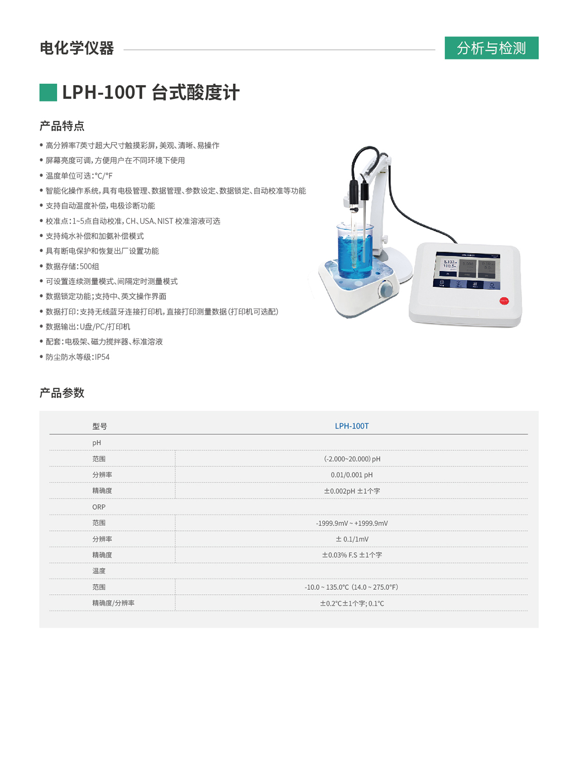 - 智能化操作系统,具有电极管理、数据管理、参数设定、数据锁定、自动校准等功能