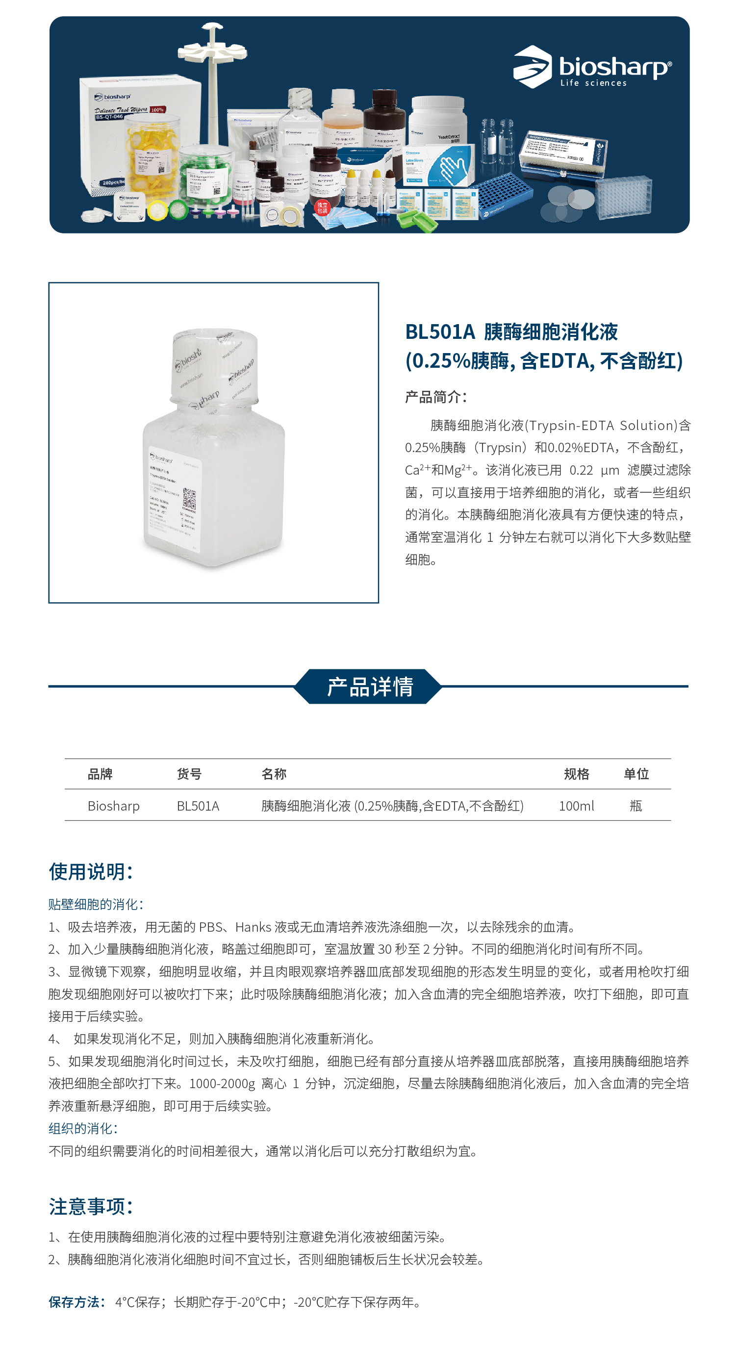 BL501A 胰酶细胞消化液(0.25%胰酶,含EDTA,不含酚红)