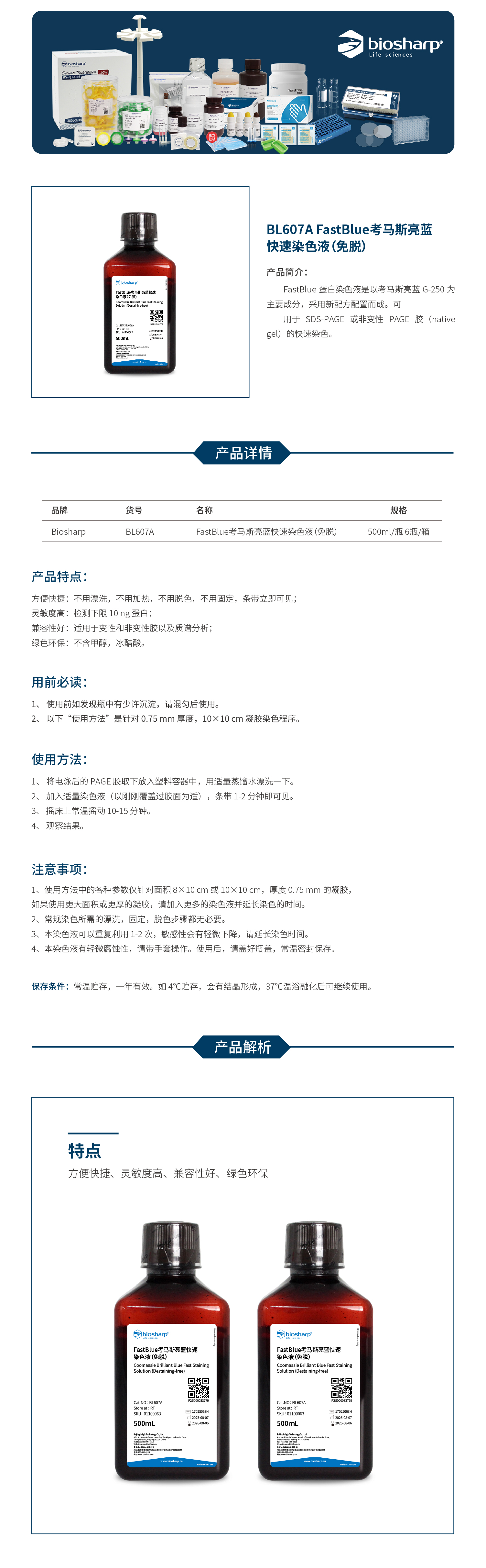 BL607A FastBlue考马斯亮蓝快速染色液(免脱)