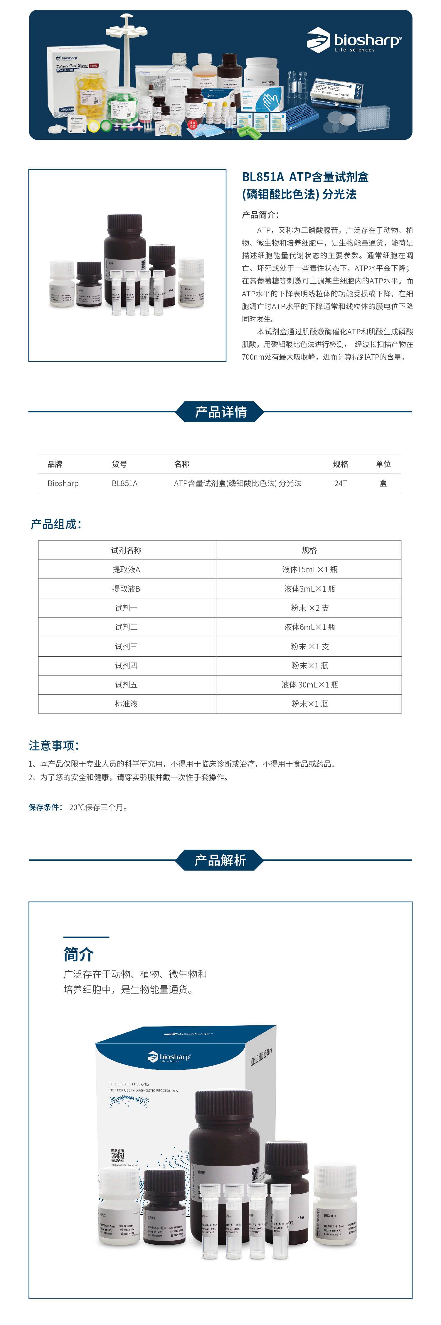 BL851A ATP含量试剂盒(磷钼酸比色法) 分光法