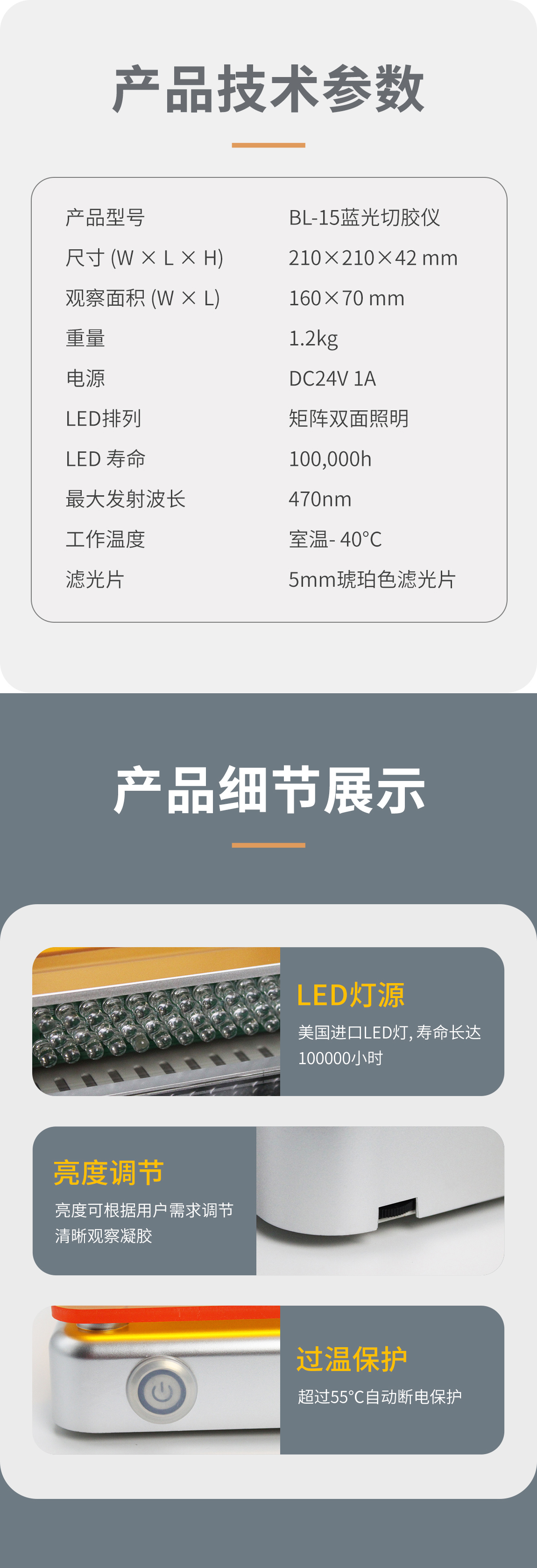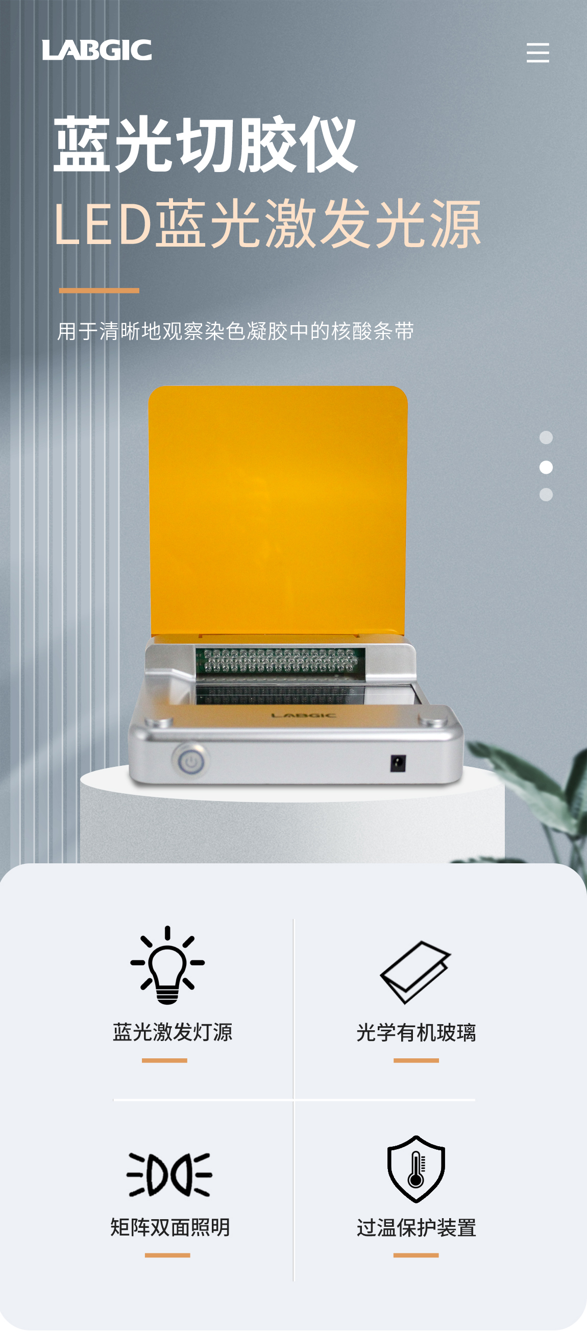- 蓝光切胶仪是采用LED蓝光激发,保护了实验人员的眼睛、脸、手等易暴露部位不再遭受紫外线的伤害。