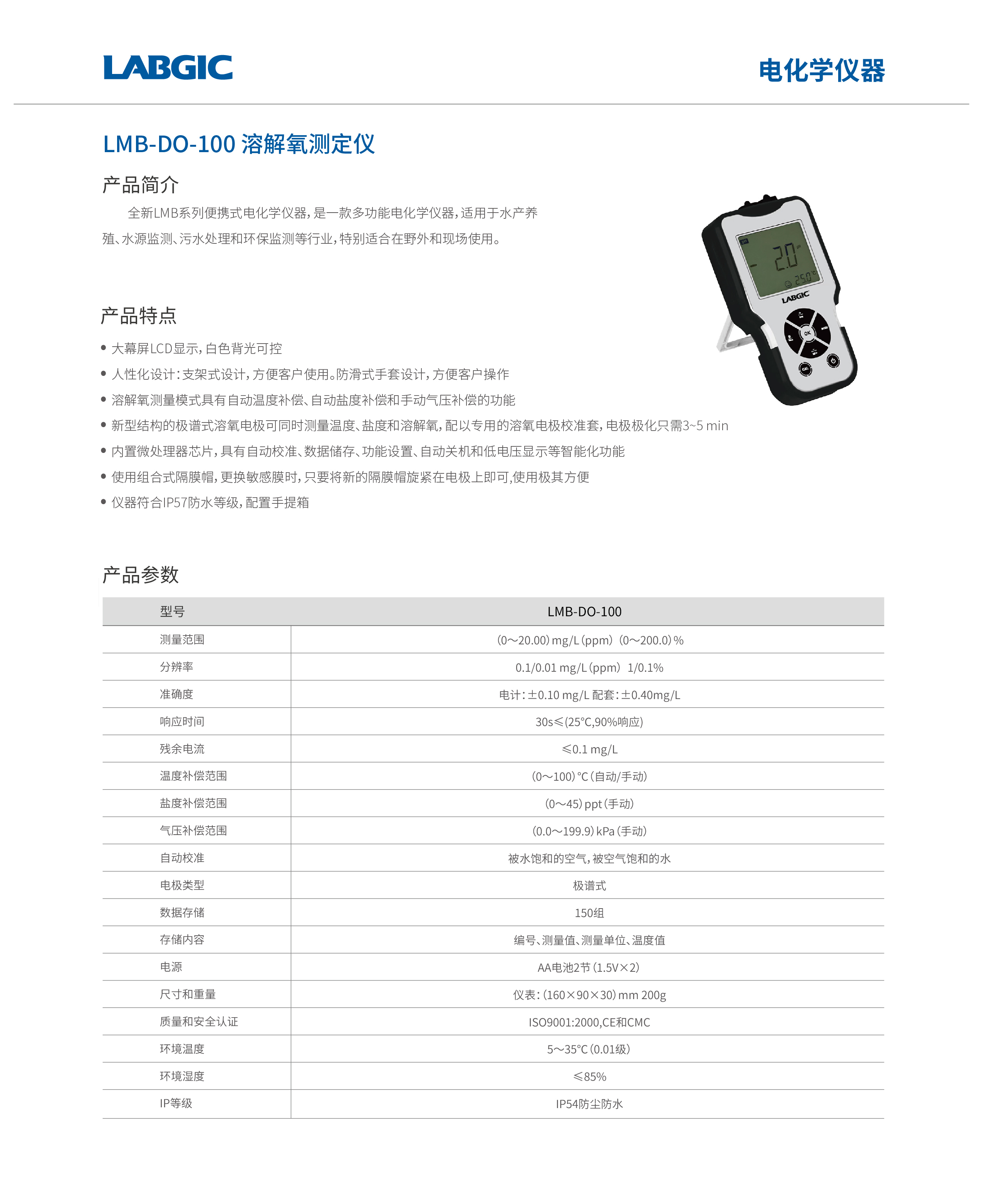 全新LMB系列便携式电化学仪器,是一款多功能电化学仪器,适用于水产养殖、水源监测、污水处理和环保监测等行业,特别适合在野外和现场使用。