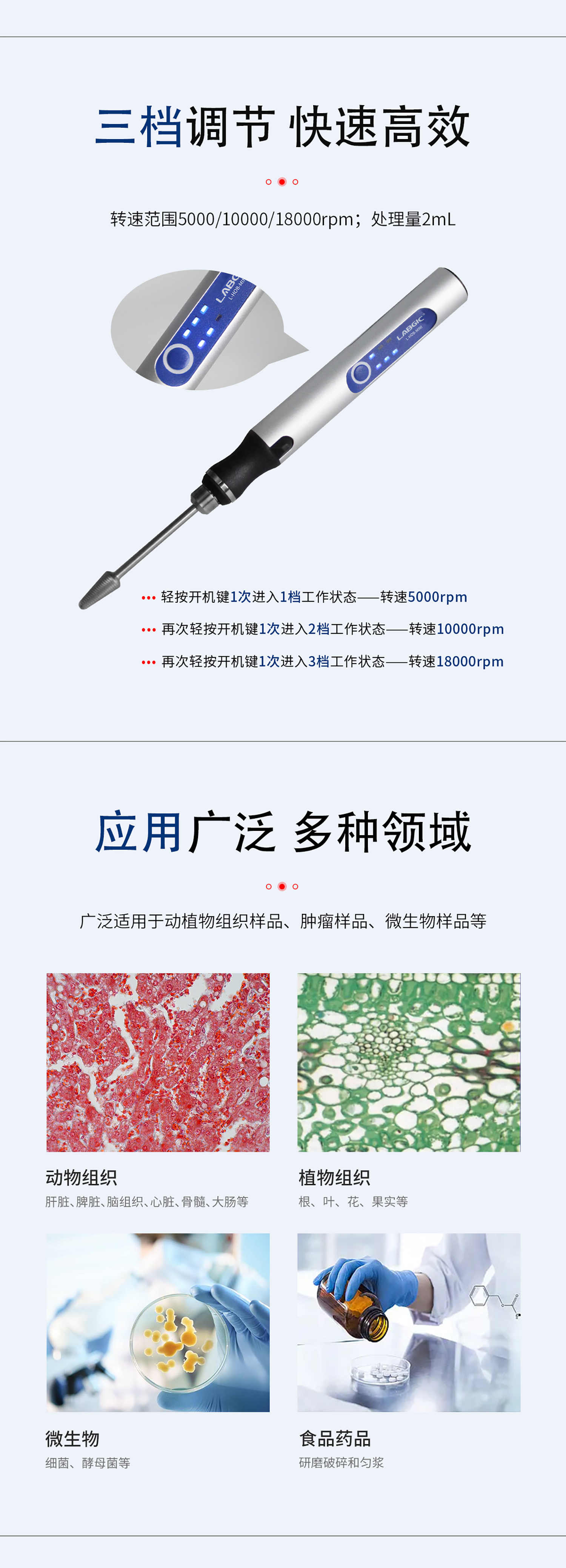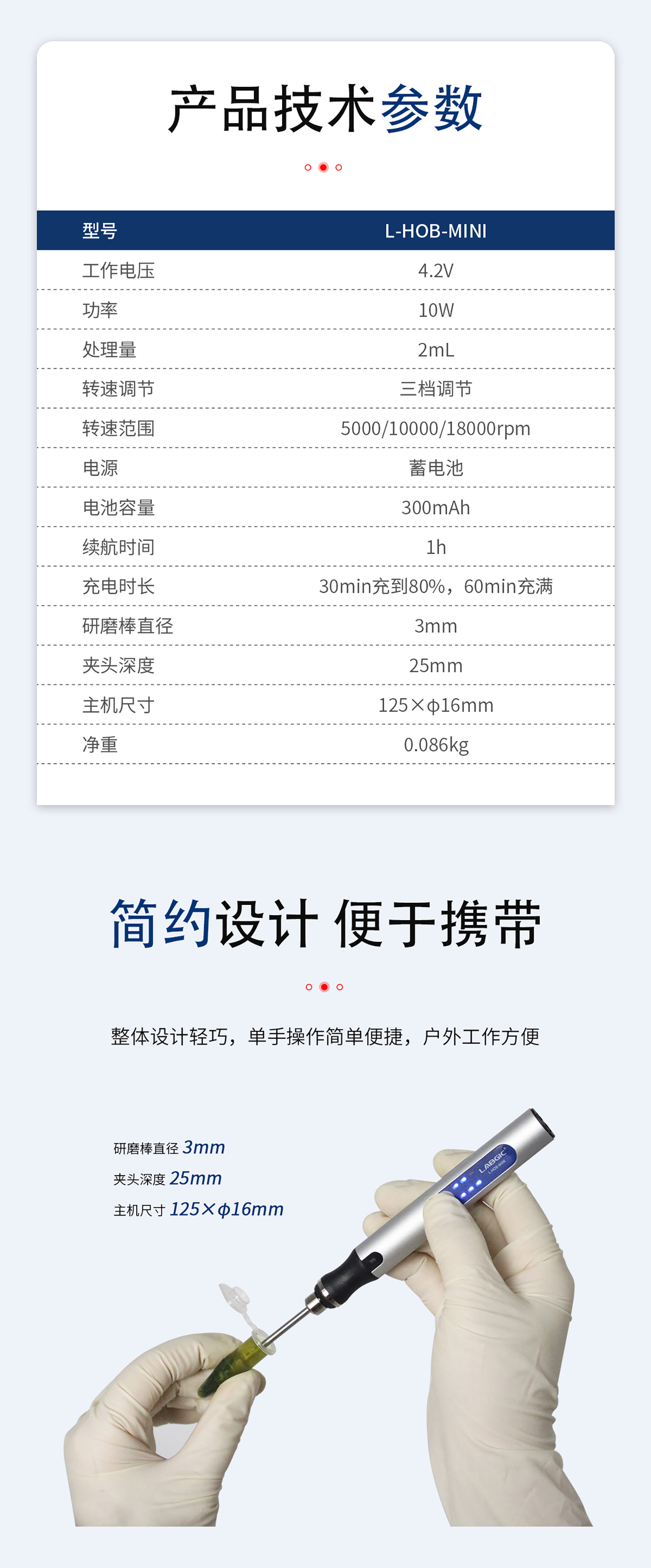 L-HOB-MINI手持式组织研磨仪是实验室常用的一种依靠电机驱动研磨头的配有可充电电池的小型组织研磨仪,对组织样品进行研磨和混匀,广泛适用于肝脏、脾脏、脑组织、心脏、骨髓、大肠等动物组织样品,肿瘤样品,根、叶、花、果实等植物组织样品,细菌、酵母菌等微生物样品,及食品、药品的研磨破碎和匀浆。