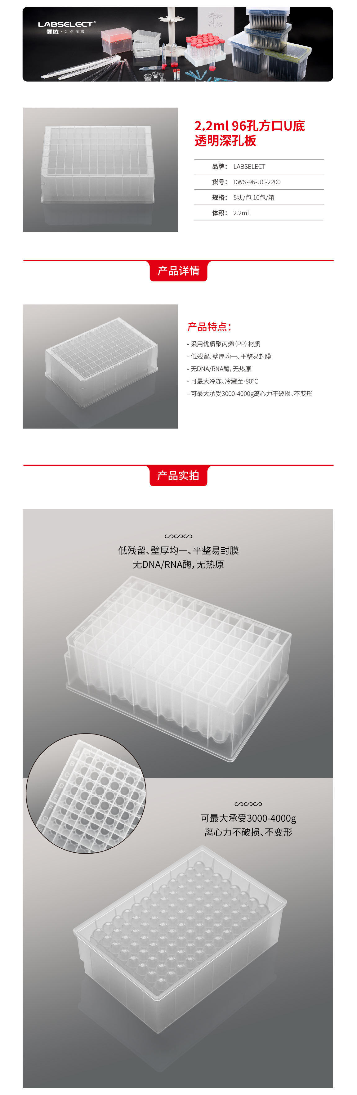DWS-96-UC-2200 2.2mL 96孔方口U底透明深孔板