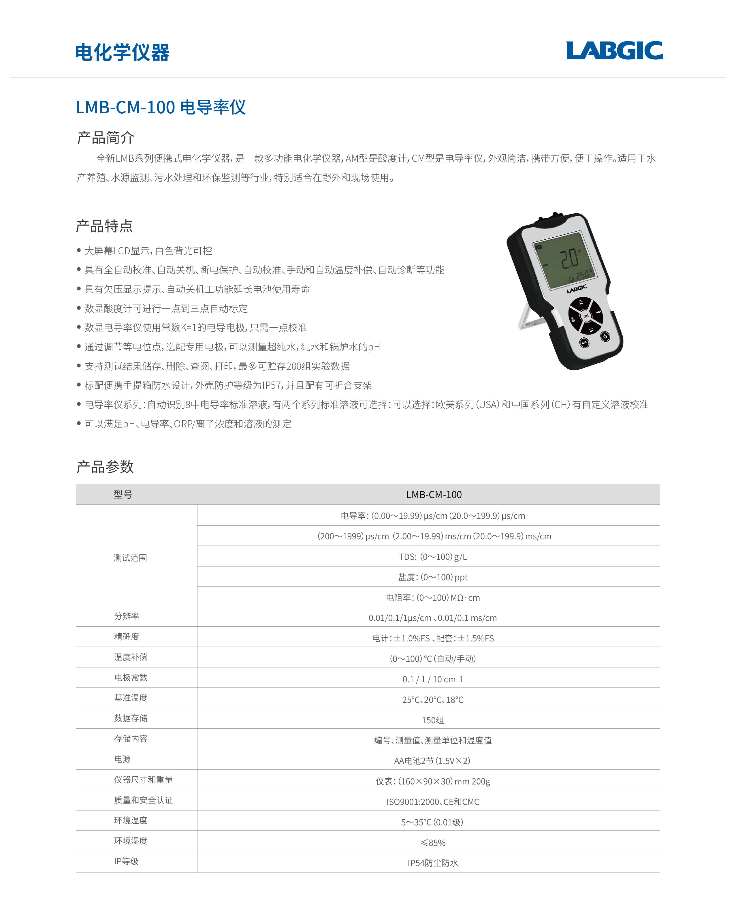 全新LMB系列便携式电化学仪器,是一款多功能电化学仪器,AM型是酸度计,CM型是电导率仪,外观简洁,携带方便,便于操作。适用于水产养殖、水源监测、污水处理和环保监测等行业,特别适合在野外和现场使用。