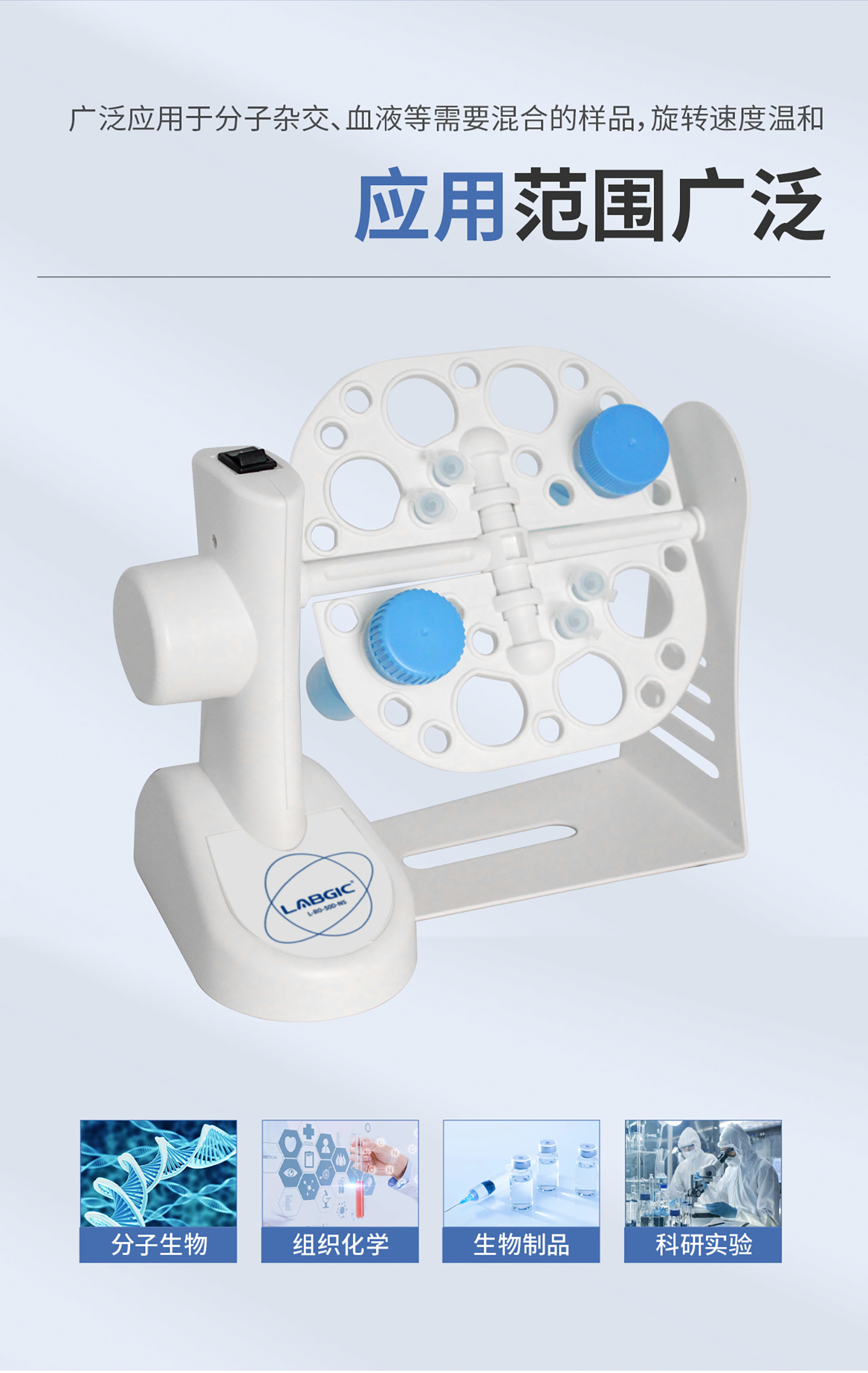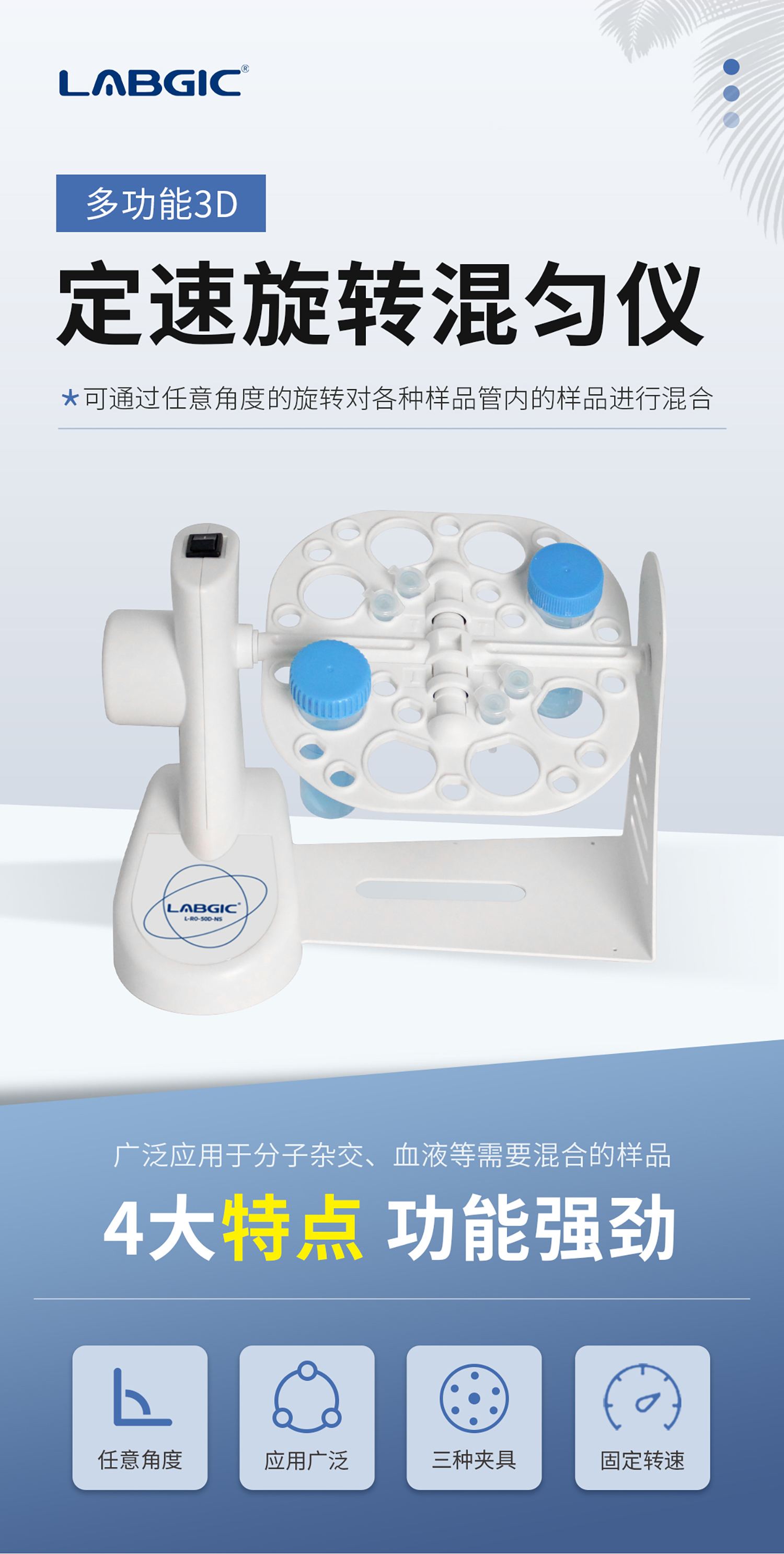 定速旋转混匀仪可通过水平、垂直或任意角度的旋转对各种样品管内的样品进行混合。通过对旋转面板的调整,可以使产品水平或垂直或介于两者之间的角度旋转,广泛应用于分子杂交、血液等需要混合的样品,旋转速度温和,位于旋转面板上的两个夹具可单独调正,可在一次混合中有两种不同的混合方式。仪器轻巧、方便转移,在实验台、冷库或者培养箱中均可使用,仪器的外壳和面板都采用了专门的设计,方便清洁及除污。
