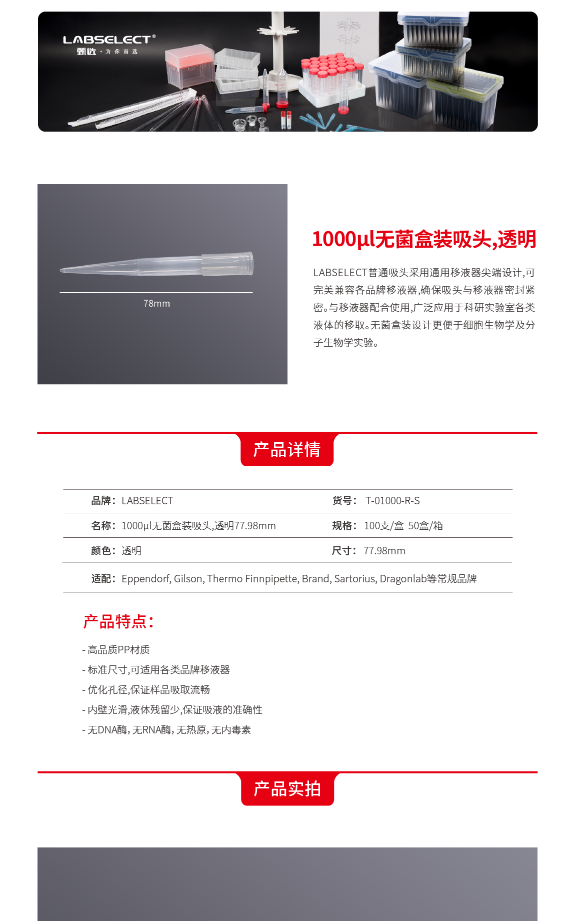 T-01000-R-S 1000μL无菌盒装吸头,透明77.98mm