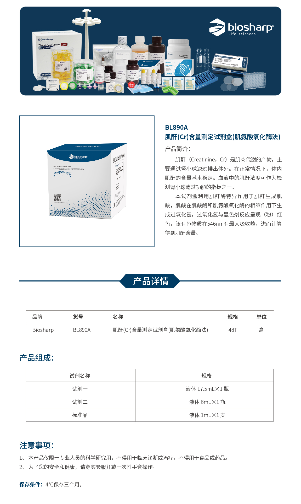 BL890A 肌酐(Cr)含量测定试剂盒(肌氨酸氧化酶法) 分光法