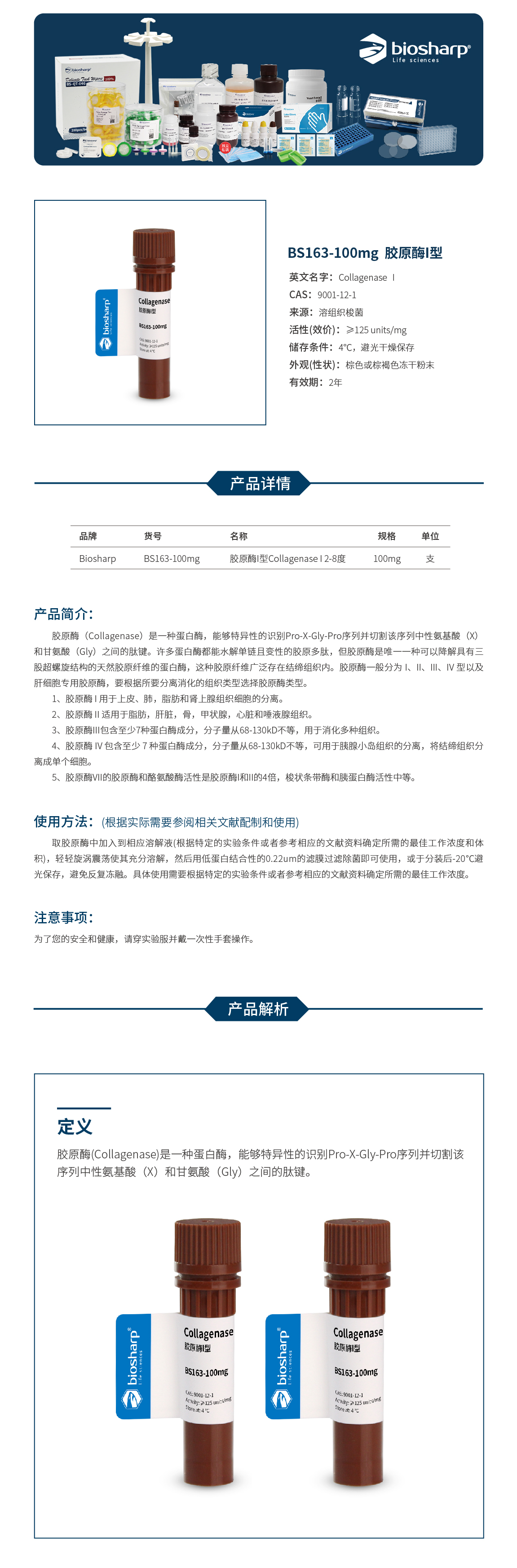 BS163-100mg 胶原酶I型Collagenase I 2-8度