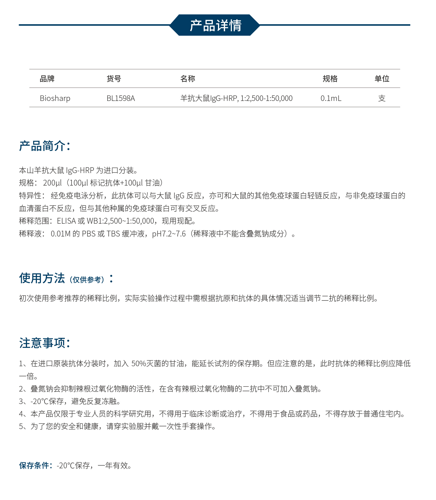 BL1598A 羊抗大鼠IgG-HRP, 1:2,500-1:50,000