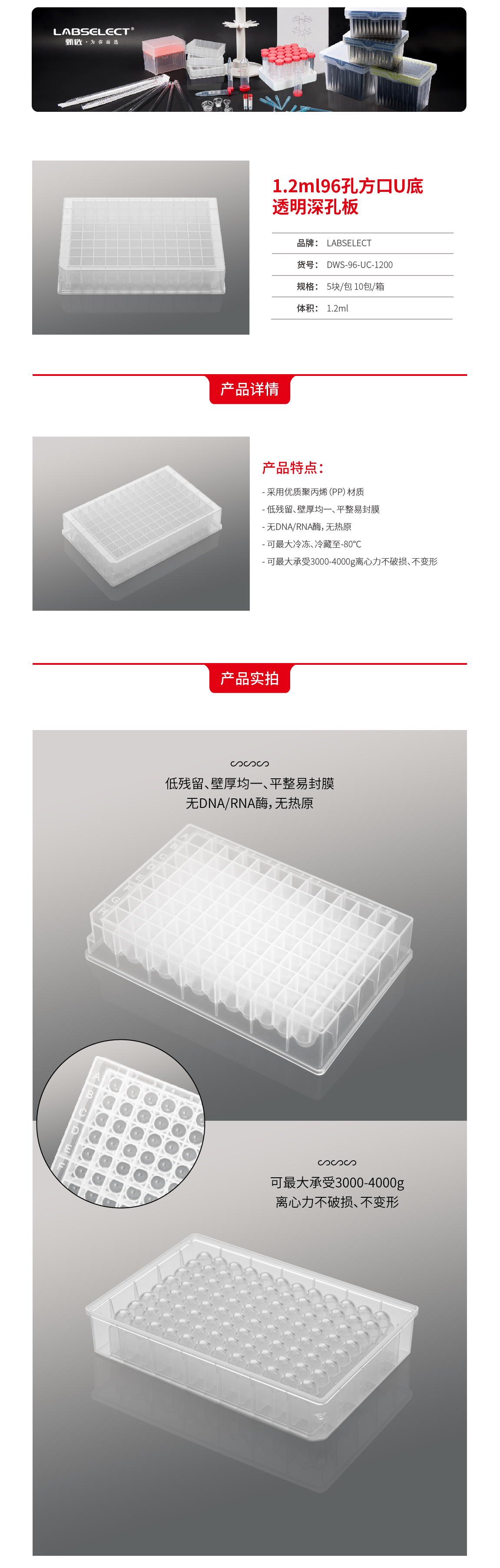 DWS-96-UC-1200 1.2mL 96孔方口U底透明深孔板