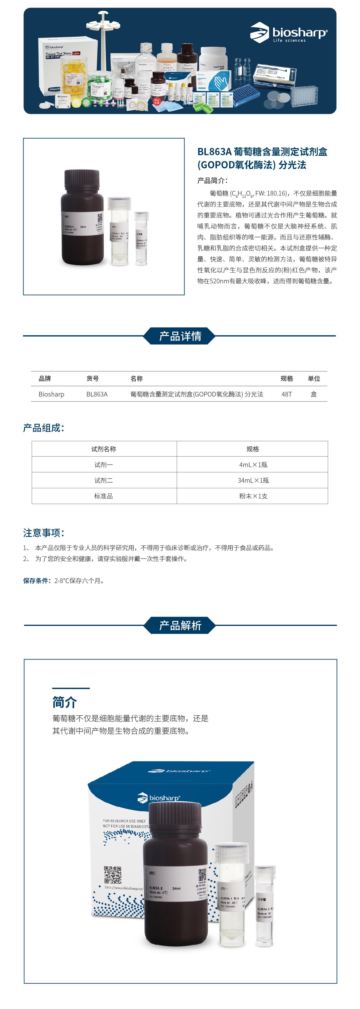 BL863A 葡萄糖含量测定试剂盒(GOPOD氧化酶法) 分光法